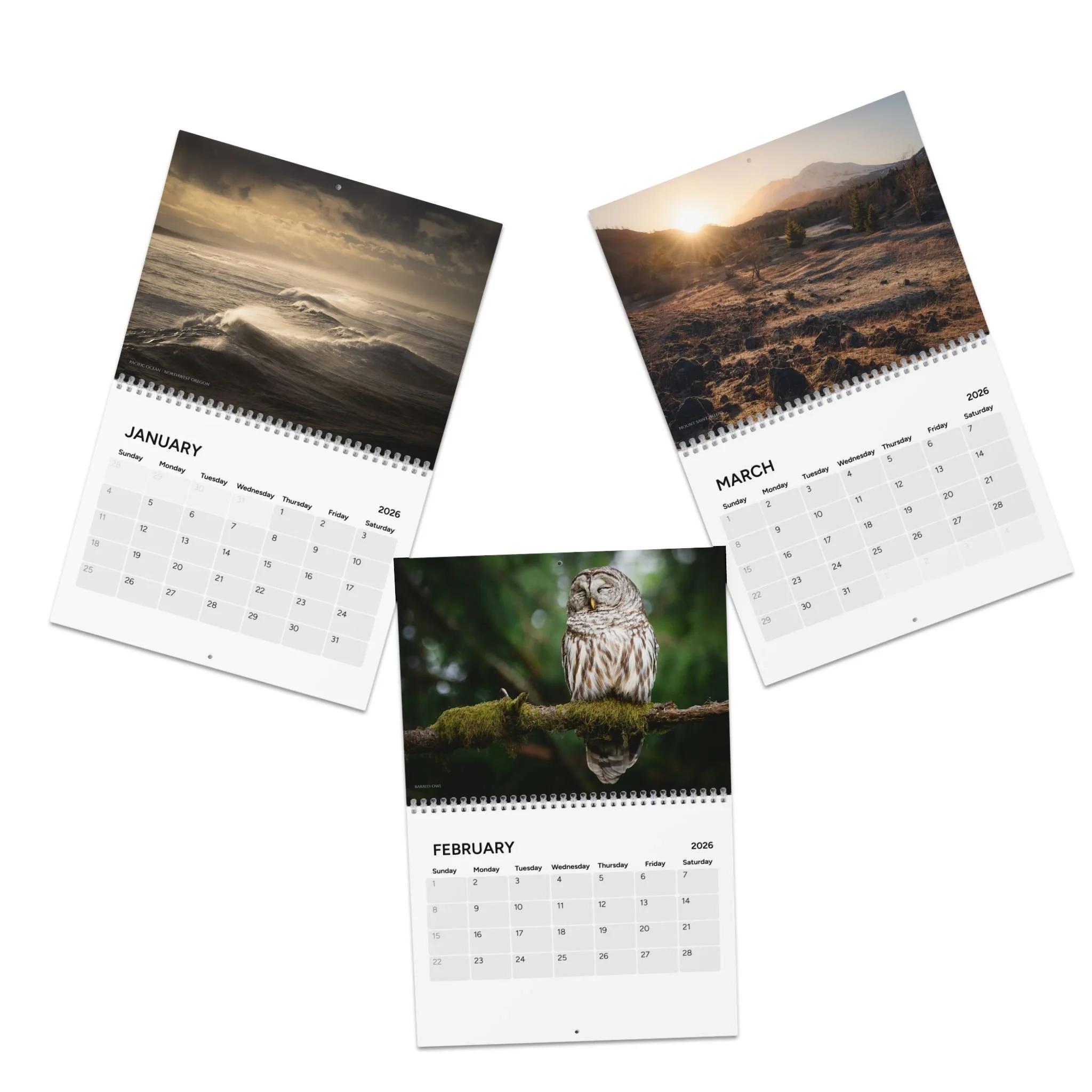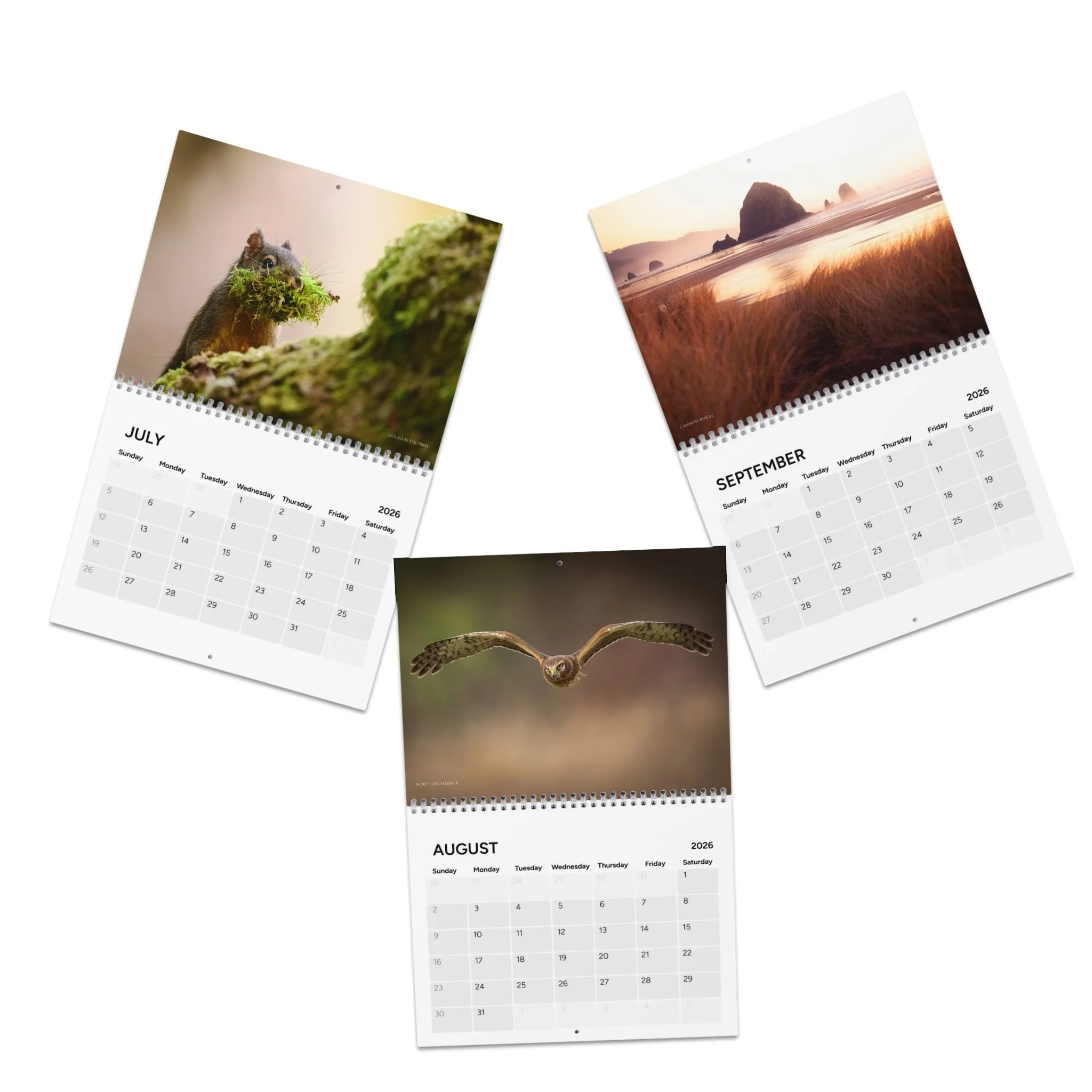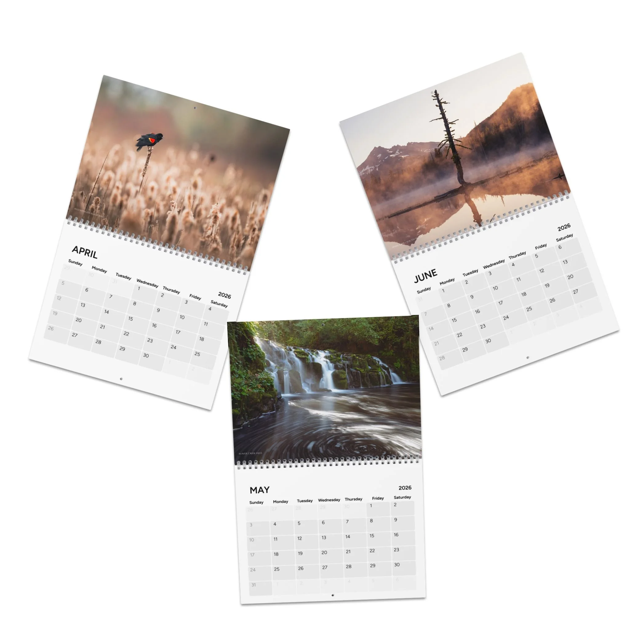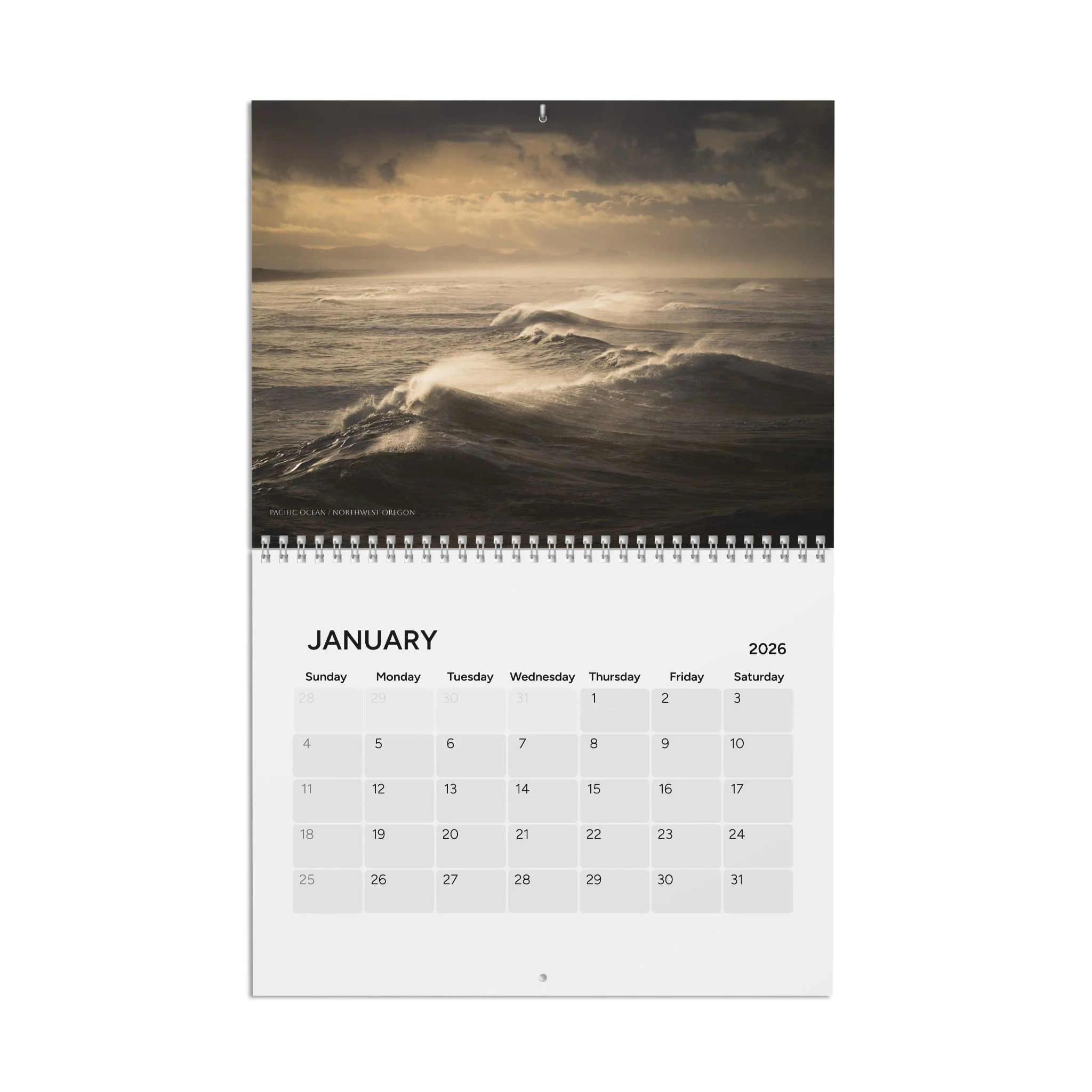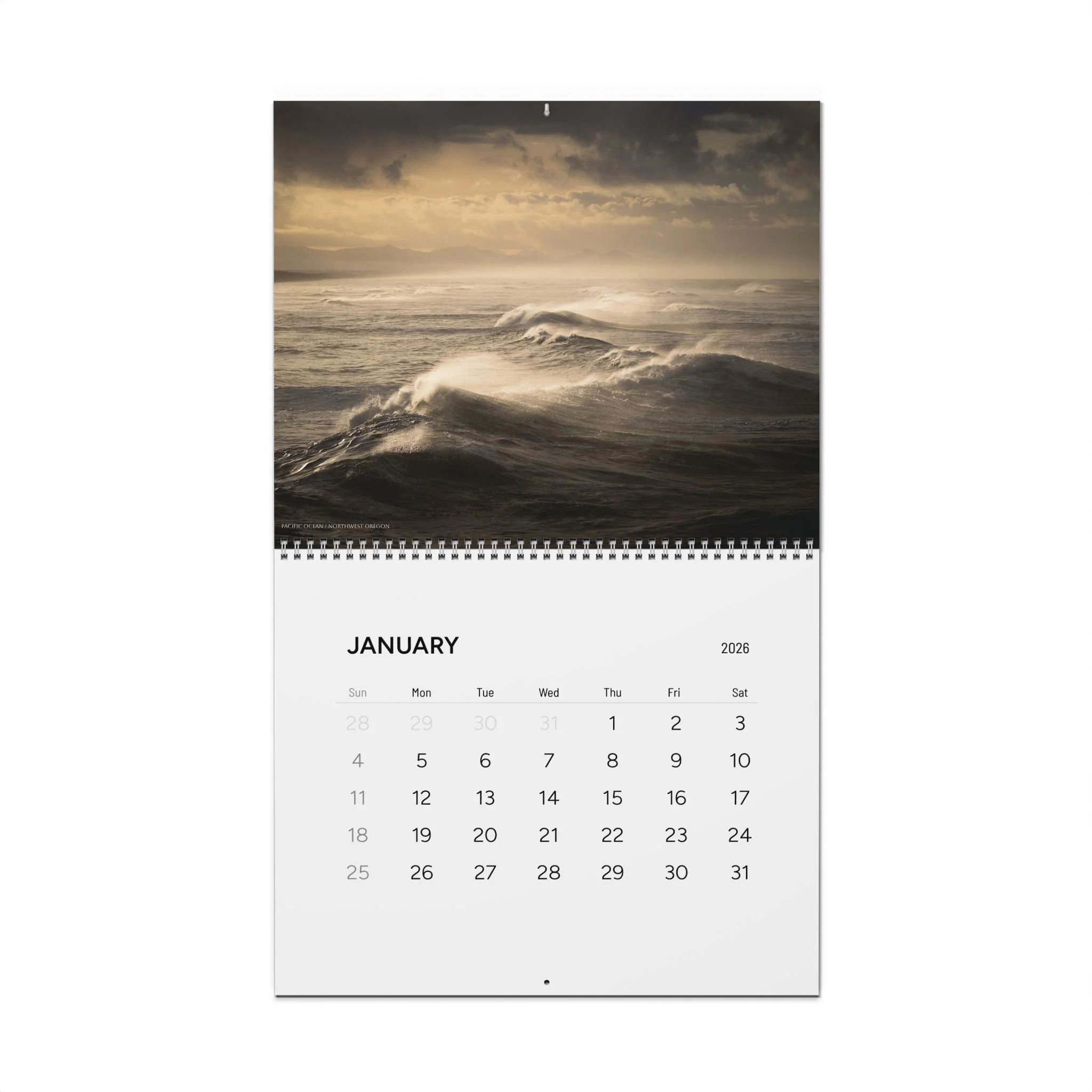 This here is a 14" x 11.5" 2026 wall calendar on fine quality glossy paper with photos taken by me throughout this past year. In this calendar you will find a mix of sprawling landscapes, intense seascapes and beautiful wildlife.